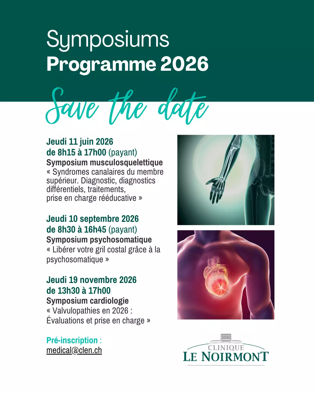 La Clinique Le Noirmont organise toute l'année des cours de formation continue pour médecins, infirmières, physiothérapeutes, diététiciens / diététiciennes, maîtres de sport, dans les domaines de la :