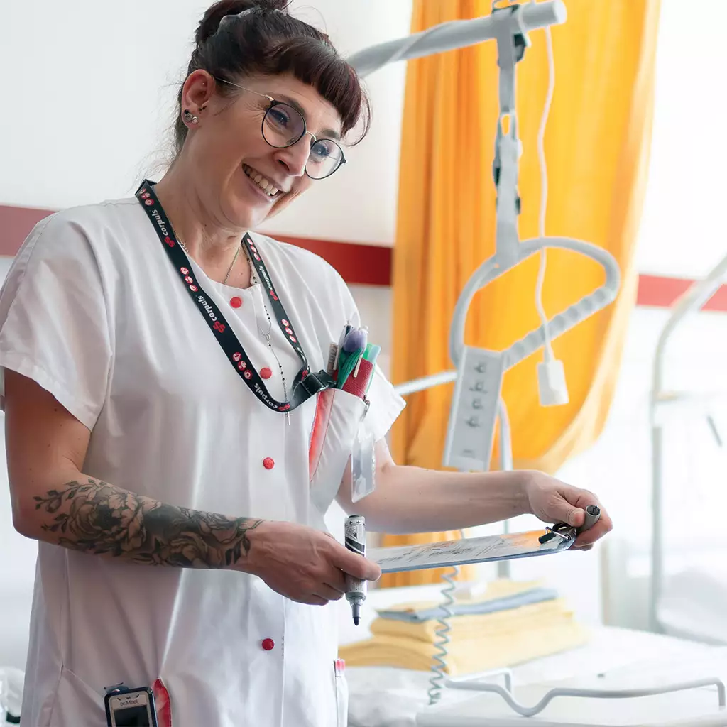 « En tant qu’ASSC j’interviens en premier lieu lors de l’entrée du patient à la clinique. Je l’aide à s’installer dans sa chambre et lui explique comment va se dérouler son séjour. Je recueille ensuite les informations principales (besoins dans les actes de la vie quotidienne, mise en place de moyens auxiliaires, goûts alimentaires, allergies, pansements, besoin en oxygène, etc.) afin que l’équipe interdisciplinaire puisse mettre en place les activités et les thérapies nécessaires.