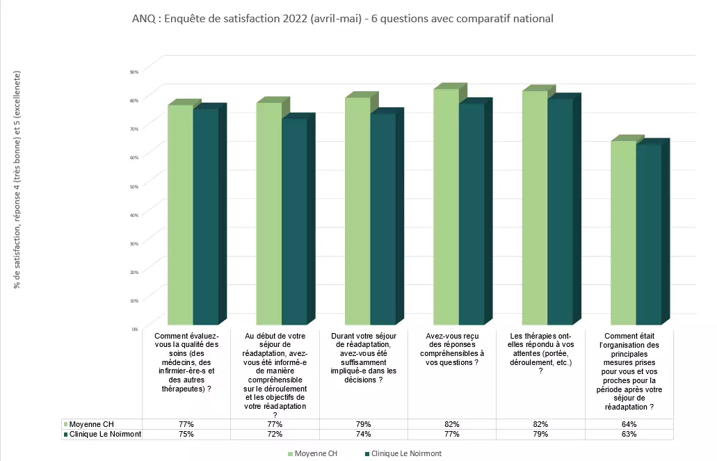 Die Clinique Le Noirmont hat an der nationalen Umfrage zur Patientenzufriedenheit im Bereich Rehabilitation teilgenommen, die vom Nationalen Verein für Qualitätsentwicklung in Spitälern und Kliniken ANQ alle zwei Jahre durchgeführt wird.