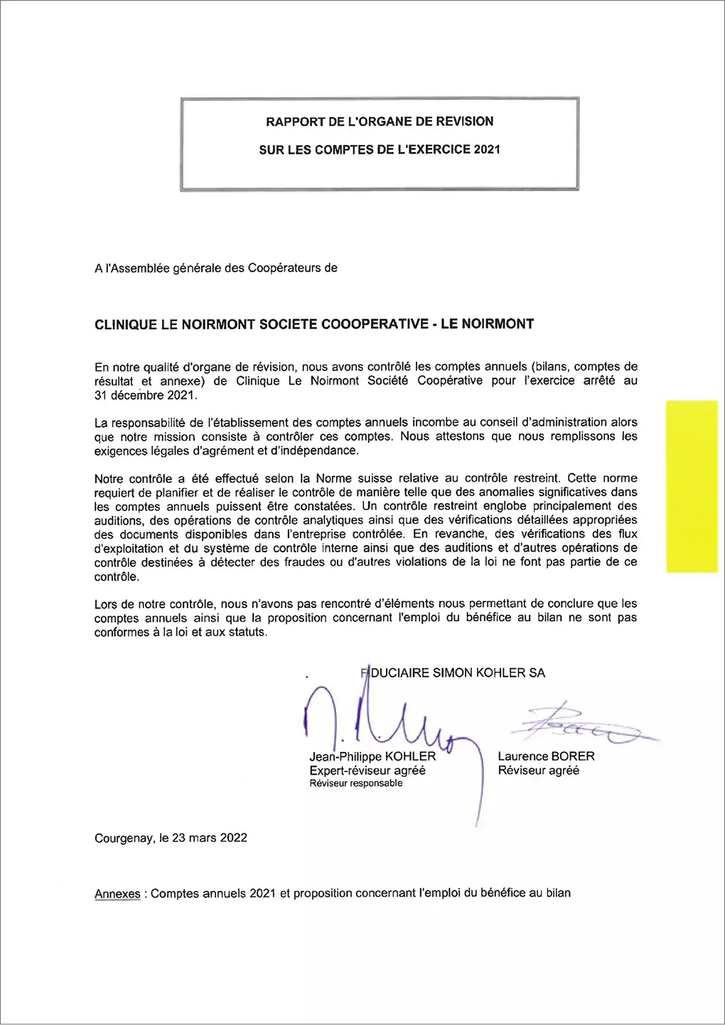Annexe aux comptes annuels de la Clinique Le Noirmont société coopérative